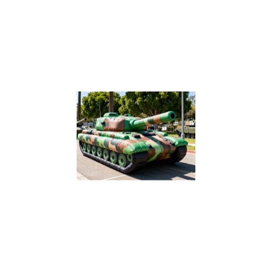 Inflatable tank (realistic camouflage, durable PVC) ideal for military training, tactical simulations, or airsoft games. Lightweight, wind-resistant, and quick to deploy for deception/training scenarios.
